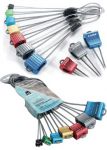 polmesiacový tvar pre efektívnejšie vklínenie, ozubenie z vonkajšej strany, zaguľatené rohy pre jednoduchšie vyťahovanie, farebne odlíšené.